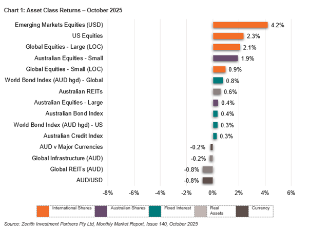 Global share markets extended their strong run in October, rising another 2.1% and bringing year-to-date gains close to 20%. Japan led performance with a 3.4% rise in USD terms, boosted by the election of Sanae Takaichi, whose pro-stimulus stance pushed the yen lower and supported equity markets.
